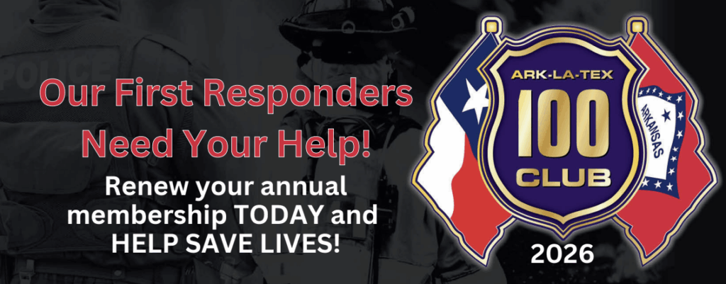 The goal of the ArkLaTex 100 Club is to raise funds for the dependents of first responders lost in the line of duty. Remaining funds are used to purchase unbudgeted but necessary life-saving equipment and specialized training for our area’s police and fire departments.